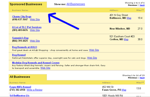 special "Sponsored Business Listing" section